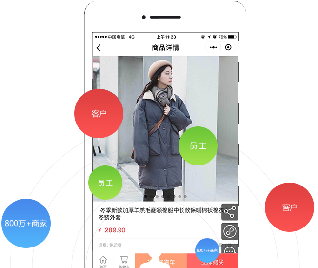 豐富多樣的營銷玩法,充分利用微信、社群等進(jìn)行多渠道推廣,你的員工幫你賣;你的客戶幫你賣;800萬商家?guī)湍阗u